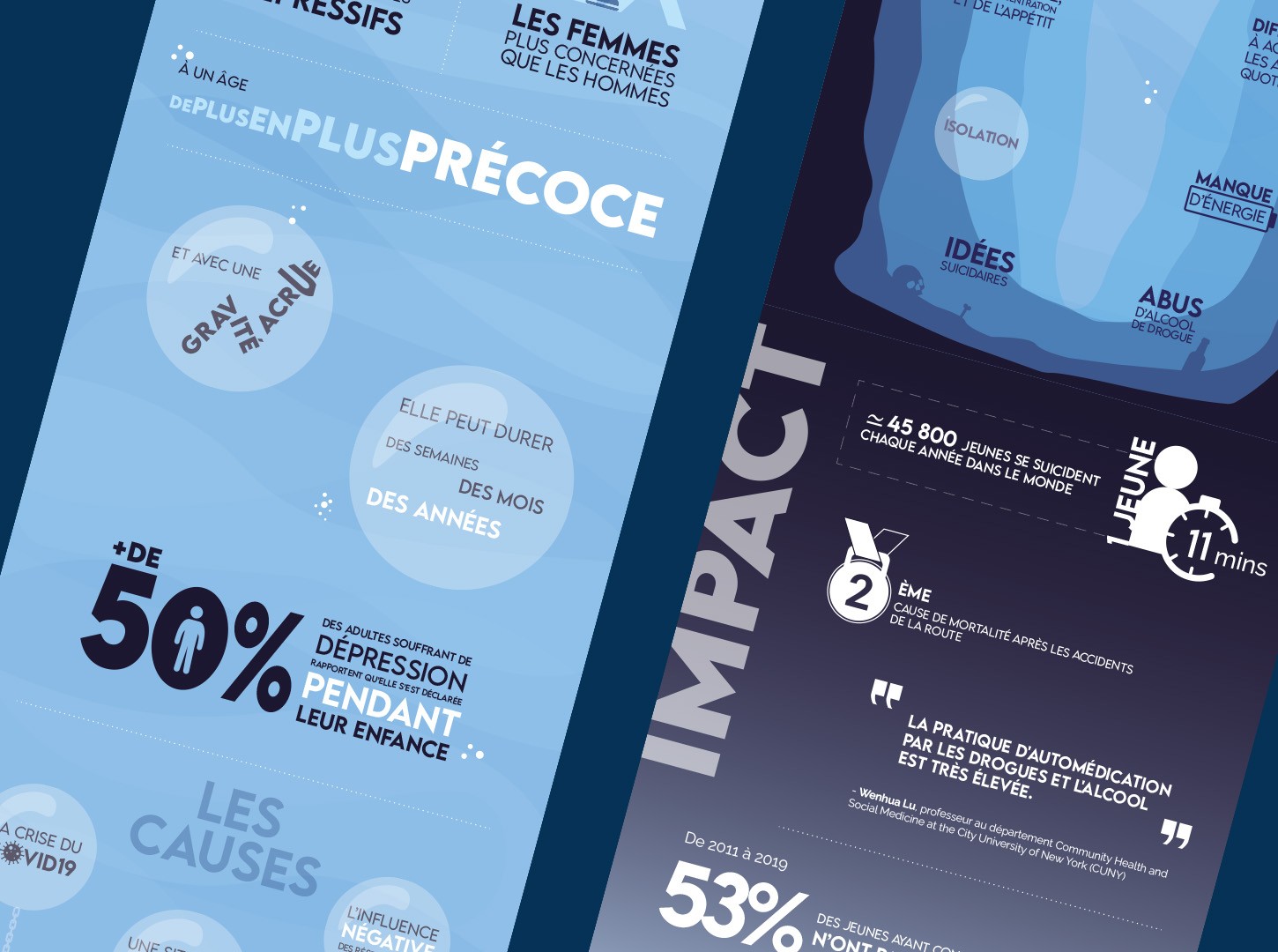 L’infographie s’appuie sur un travail de synthèse et de hiérarchisation des données afin de structurer l’information de manière lisible. Le parti pris graphique repose sur la métaphore de l’immersion et de la descente, évoquant le sentiment de “couler” souvent associé à l’expérience de la dépression.